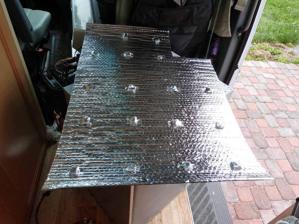 Reflectic in a loose grid to make the air space. I put this on the back of the cavity in two layers directly on the van metal skin, one layer on the top of the refrigerator, and on the back. On the back of the refrigerator, I put 2 layers except where the van rib juts into the cavity. I only put one layer there to ensure adequate air flow between the lower and upper vents for the compressor. I also put a single layer of